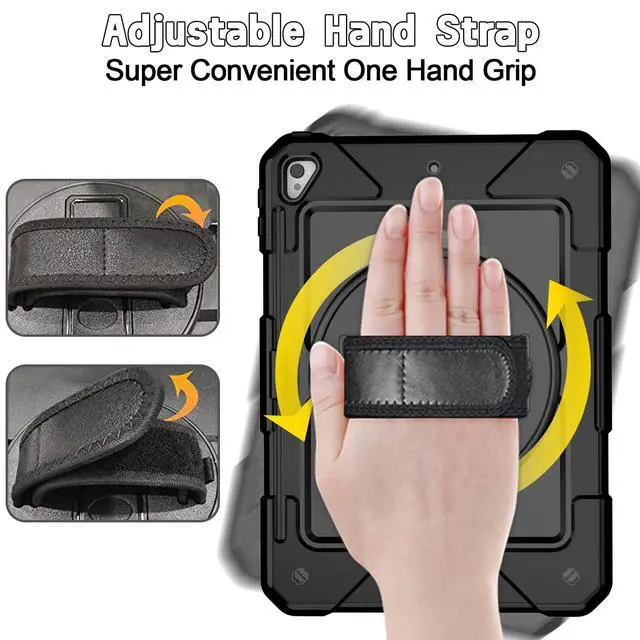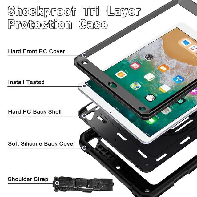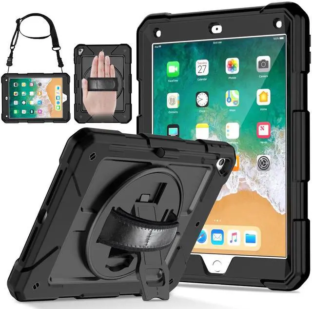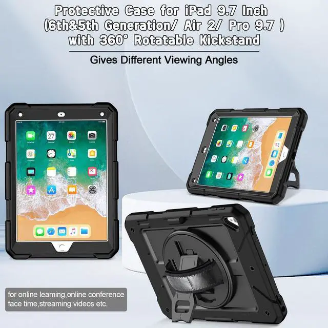 Air 2 (Model: A1566 A1567) ^^ Super Sturdy - iPad 5th Generation Case 9.7 inch, construct from fine material like silicone rubber and polycarbonate, durable, shock-resistant, gives decent protection for your 9.7 iPad 6th/5th generation, iPad Air 2 and Pro 9.7 tablet ^^ Great for Grip/Hold - 6th Generation iPad Case 9.7, rugged design, anti-slip surface made it easy to hold, even for little kids, and hand-strap can be easily adjusted according to the size of your hands ^^ Fun and Functional - iPad 6th Generation Kid Case, colorful, attractive for children, plus it comes with pencil holder, swivel kickstand, hand strap and shoulder strap, allows hands-free viewing in different comfy angles, available on the go ^^ Worth Every Penny - 6th Generation iPad Case, hang it on the car headrest, set-up the stand in kitchen while cooking, take it to school/gym/picnic/camping/outdoor etc. It can be put to use in many settings, absolutely kids-friendly, great value, decent protection, wonderful gift choice for family and friends
