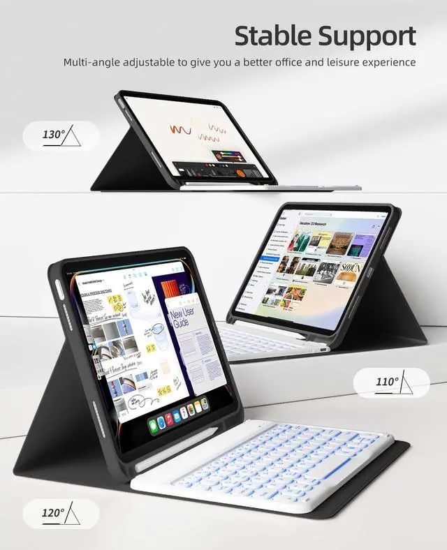 achieves: 230+ hour standby time, 2-hour full charge via USB-C PD 3.0 protocol, 1, 200+ charge cycles (FCC Part 15 compliant). ^^ Premium Vegan Leather ProtectionCrafted with luxe-grade PU leather, the iPad 11th gen/10th gen Keyboard Case delivers a sophisticated texture that's both cloud-soft to touch and business-ready in appearance. With scratch-resistant coating that repels daily wear. Every functional detail stays accessible through laser-precise cutouts, including charging ports, stereo speakers, and TrueDepth camera. The honeycomb ventilated backplate actively regulates thermal output, ensuring optimal performance for processor-intensive tasks. ^^ Pro-Level Viewing FreedomThis iPad 11th gen/10th Gen convertible keyboard case offers three precisely adjustable tilt positions to ensure optimal screen alignment in any setting. The polymer grooves securely lock your tablet at angles of 110, 120, or 130. This versatile 2-in-1 solution is ideal for dorm room study sessions, business travel, and creative work-from-home scenarios, eliminating the need to switch between tablets and laptops. ^^ After-sales ServiceGKABXY as a reliable brand, Our Support Team operates 24/7 friendly customer service. If you have any questions, please feel free to contact us via message, we will help you at any time.