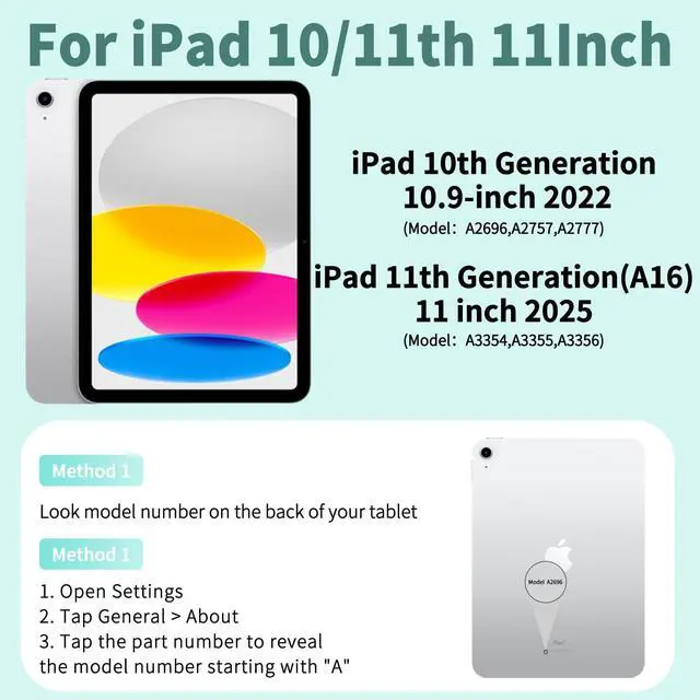 • iPad 11th/10th Generation Case with Keyboard 11/10.9 InchThis keyboard case compatible with iPad 11th Generation 11 inch 2025 (Model Number:A3354/A3355/A3356), compatible with iPad 10th Gen 10.9 inch 2022 (Model Number:A2696/A2757/A2777). Not for any other models. Please check the model number No. "AXXXX" on the back of your iPad to confirm correct size before purchasing iPad keyboard case.