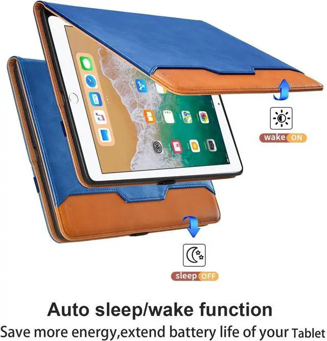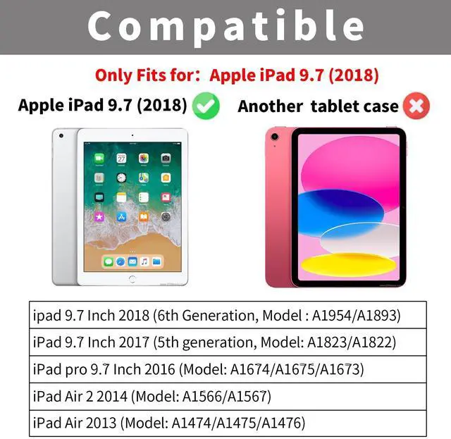 Air1 (Model: A1474/A1475/A1476). Please check your model number before the purchasing. ^^ Full ProtectionThe iPad 6th generation cases adopt premium synthetic leather material to protect your tablet from scratches, dust, or any other daily damage. Come with elastic hand strap help secure the front cover with the back shell for outstanding full protection when close the front cover. ^^ Auto Wake/SleepThis iPad 5th generation case supports automatic sleep/wake function. Easy to use, protects and extends battery life. ^^ Multi AnglesThis case iPad 6th generation provides two anti-slip slots which able to adjust most comfortable angles for watching movies or typing. ^^ Large PocketThe iPad 9.7 inch case featured as large front document card pocket for notes, cash, and cards etc, with a built-in magnetic closure to prevent loss, perfect for carrying while shopping or traveling.
