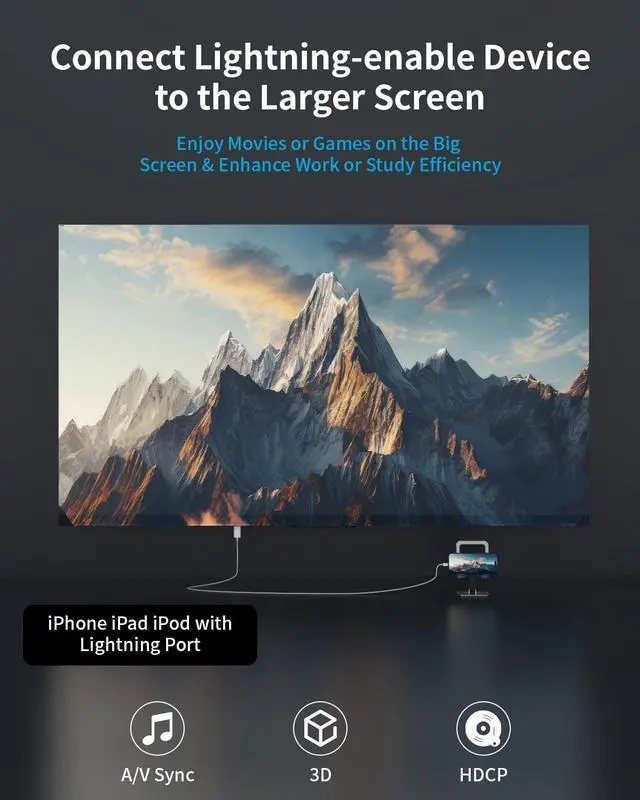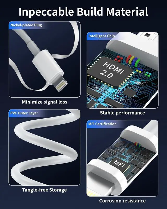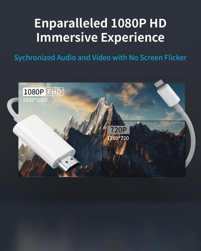 Digital AV Adapter: The iPhone to hdmi adapter offers unique features that set it apart from the competition. Our Lightning to HDMI Adapter is equipped with an MFi certified chip, ensuring stable video output. Enjoy content stress-free on a large screen without experiencing delays. Whether you're presenting, gaming, or streaming videos, our ipad to hdmi cable adapter delivers reliable and lag-free performance, you can enjoy crystal-clear audio and high-definition video with ease ^^ Hassle-Free Lightning to