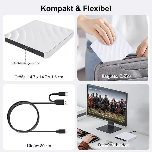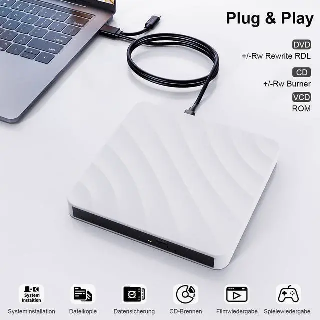 ^^ Plug & Play: The CD / DVD burner is powered via the USB port. No additional power supply required. Simply connect the CD / DVD drive externally to your computer and it will be recognized. You can burn files, install software and create backup CDs. With this external optical drive you can watch DVD/CD movies instantly and burn music and movies to disc.