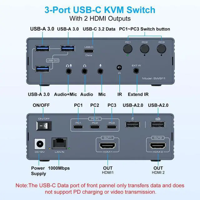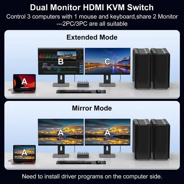 Kvm Switch 2 Monitors 3 ComputersThis Usb docking station supports seamlessly connect 3 computers (USB 3.0 /Thunderbolt) to 2 HDMI displays, supporting mirror or extended mode. Share 1 keyboard/mouse, 3 USB 3.0 ports, 1 USB-C 3.2 port, Gigabit Ethernet, and 3.5 mm audio jack to enhance workflow efficiency and save desk space.