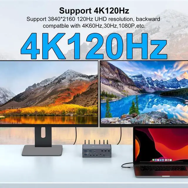 Recommended: CPU Intel i7 or above, and 16GB RAM to ensure optimal performance. ^^ Dual 4K@120Hz DisplayThis KVM switch docking station supports dual-monitor setups with two dedicated HDMI outputs, each capable of 4K@120Hz simultaneous display. It eliminates the need for DisplayPort, offering a streamlined plug&play solution for seamless device switching while maintaining ultra-smooth, high-resolution visuals on both screens