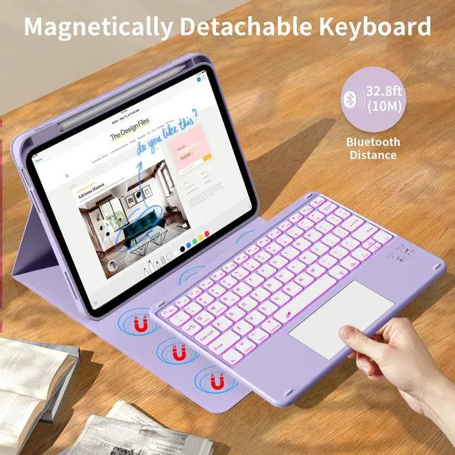 Slim Wireless Bluetooth KeyboardThe slim (6.2mm) removable keyboard is attached to this iPad cover with keyboard magnetically (supporting Windows, IOS & Android System), let your ipad instantly become a portable laptop, perfect for working, typing, editing or watching videos, greatly improved your iPad productivity.