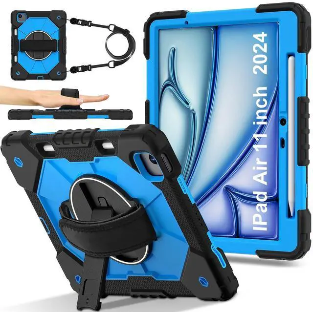 Meifei Case for iPad Air 11 inch M2 2024,Tablet case for iPad Air 6th Generation, Kids case Shockproof Protective with 360 Rotate Kickstand Hand Strap Shoulder Strap Cover, Black/Blue