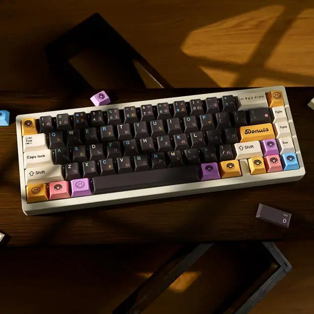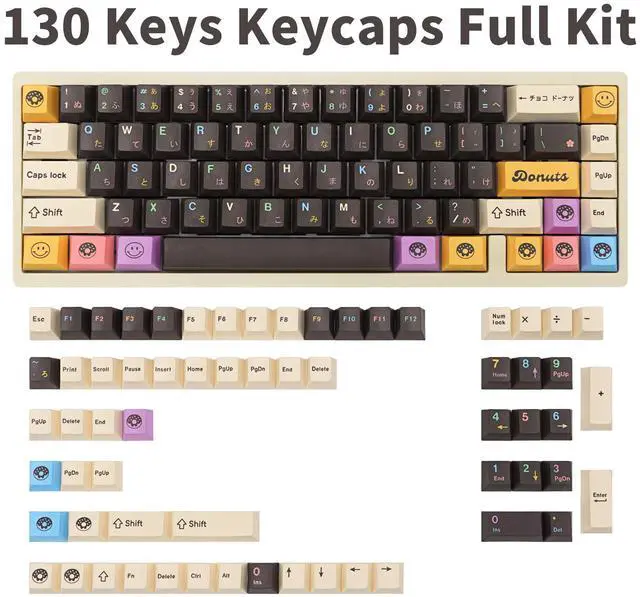 Premium PBT KeycapsCrafted from high-quality PBT plastic, these keycaps resist wear, fingerprints, and oil buildup, ensuring a clean, long-lasting typing experience even with heavy daily use. ^^ Dye-Sublimation Advanced five-side dye-sublimation technology permanently infuses vibrant donut-themed designs into the keycap surfaces, delivering fade-resistant colors and crisp patterns that withstand years of use. ^^ Cherry ProfileDesigned to match original keyboard layouts with an optimized height and curvature, these keycaps provide natural hand alignment and reduced fatigue for extended typing sessions. ^^ Universal Compatibility Perfectly fits 60%, 75%, and full-sized mechanical keyboard layouts, accommodating standard switch types for seamless upgrades across a wide range of setups.