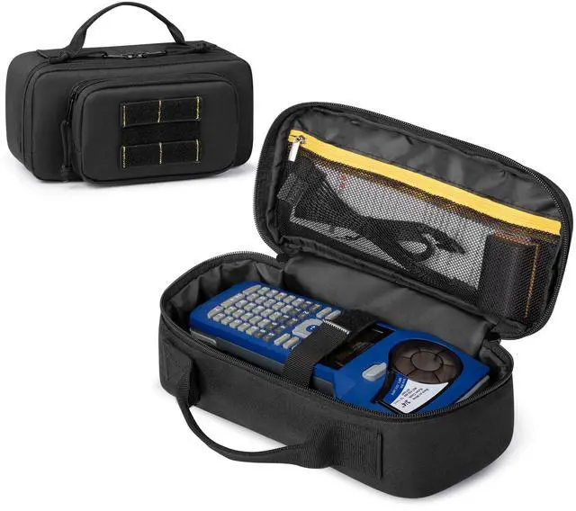 ^^ PRECISION STORAGE: The main compartment features a pair of adjustable fixing belt to tighten the label printer, with an internal mesh pocket for storing batteries, USB cable and other accessories. Front pocket can hold up to 3 authentic labels.