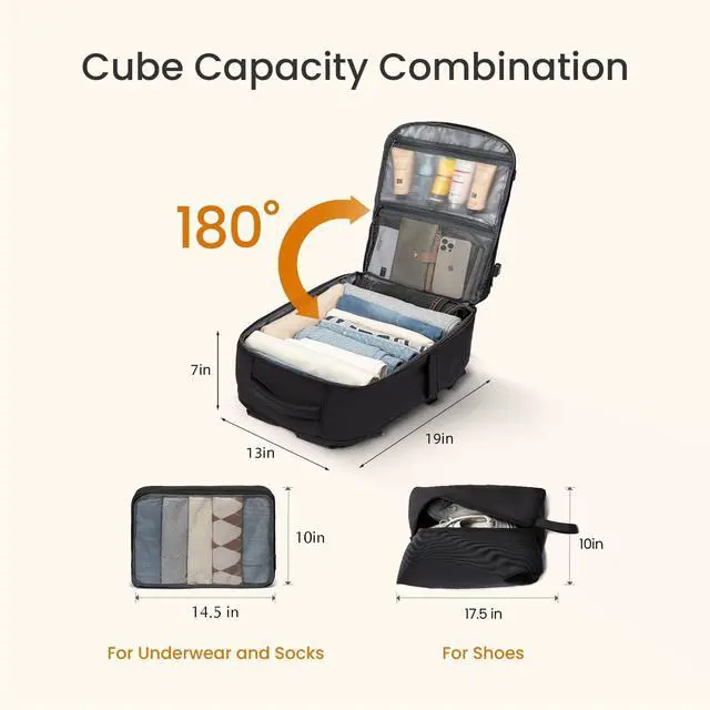 Features: Expandable Large CapacityTravel backpack for men women with expandable design, backpack for travel giving you flexible large capacity, large size from 30L to 40L, Extra large size from 40L to 50L. Carry on backpack has 3 large compartment for your ipad, laptop, clothes and travel essentials. 2 Packing Cubes for Daily EssentialsTravel backpack with 2 cubes for organized storage of sweaters, jackets, pants, shirts, shoes and toiletries. Crafted from water-resistant polyester, it protects your belongings in various weather conditions. 12-Pocket Smart OrganizationThis carry on backpack for men has 12 pockets for iphone, ipad, power bank, laptop, clothes, shoes, sweaters dadily and travel essentials. This travel backpack opens 180 degrees for easy access and hassle-free security checks. Durable, Waterproof & ComfortableMade from tear-resistant polyester fabric, this personal item travel bag is waterproof and durable. Smooth zipper and comfy back padding can great release your fatigue during weekender or long travel. TSA Approve and MultipurposeTSA friendly design, the carry on backpack for men women fits overhead and under seat while on state of standard carry on size, ideal for business or weekend travel, and easily carried on most flights.