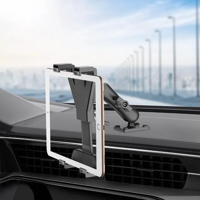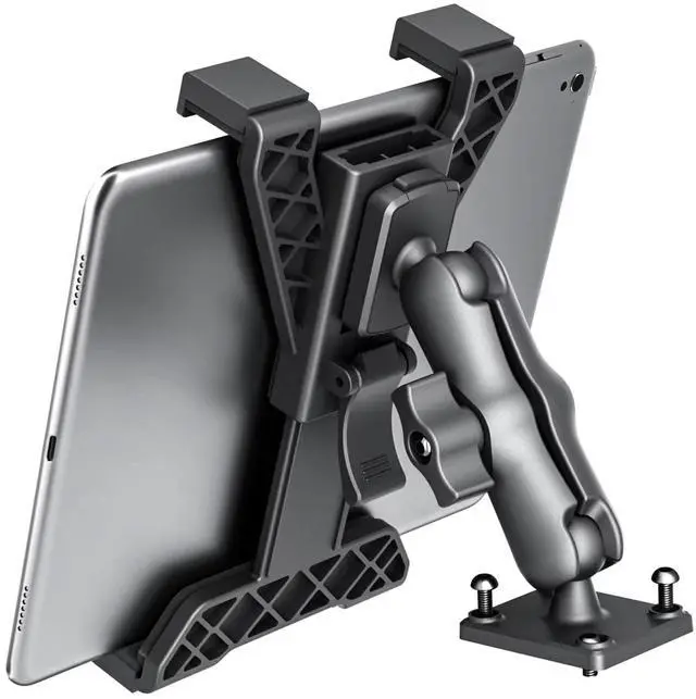 MULTI-FUNCTION TABLET MOUNTHeavy duty drill base mount car tablet holder with ball and socket joints at each end allowing a full range of motion. The arm allows quick adjustment using a simple thumbscrew, tablet mount designed to install directly on a table, cart, desk, in a vehicle, or on any flat surface and provides a rock solid, vibration free hold. ^^ INSTALLATIONThis car tablet holder adopt a new design, tablet holder base has 4 holes for semi-permanent installation with screws (we provide screws) suitable for any car.