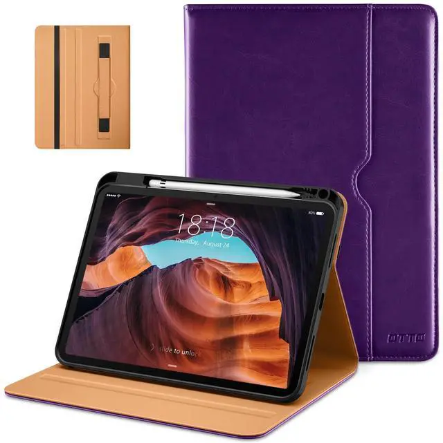 Number: A2757/A2777/A2696). Not compatible with any other model ^^ Built-in Pencil Holder - Securely carries and protects your pencil wherever you go. A hole has been designed at the back of the pencil holder that you can easily push pencil out without taking off your iPad 11/10 case ^^ Magnetic Smart Cover - Support Auto Wake/Sleep, built-in leather hand strap(one-handed operation) and external elastic band enhances magnetic closure ^^ Multi Function - Multiple horizontal bracket angles for comfortable watching movie or typing. Features front document card pocket to keep notes, cash, cards ^^ Premium Material - Exterior is made of premium synthetic leather, lined with microfiber provide full protection for your iPad 10th Generation, against impacts, drops and scratches