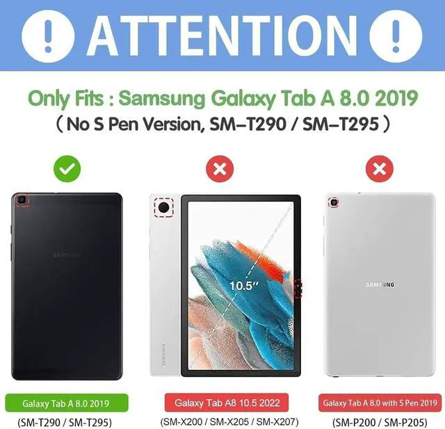 CompatibilityDesigned for Samsung Galaxy Tab A 8.0 Inch 2019 SM-T290/SM-T295 No S Pen. Precisely cut to preserve full use of volume buttons, charger, camera, microphone, headphone jack, and other ports or buttons, perfect fit. Easy to install and remove. ^^ High qualityGood quality with PU synthetic leather exterior and non-slip inner lining. Sturdy materials provide full protection for your tablet. It is closed with an elastic band, which makes the tablet firmer when closed, and protects the screen and the cards inside from falling out. ^^ Multi-angleMultiple deep grooves, multiple horizontal stand angles adjustable, you can fix your tablet in an ideal viewing angle or comfortable position.