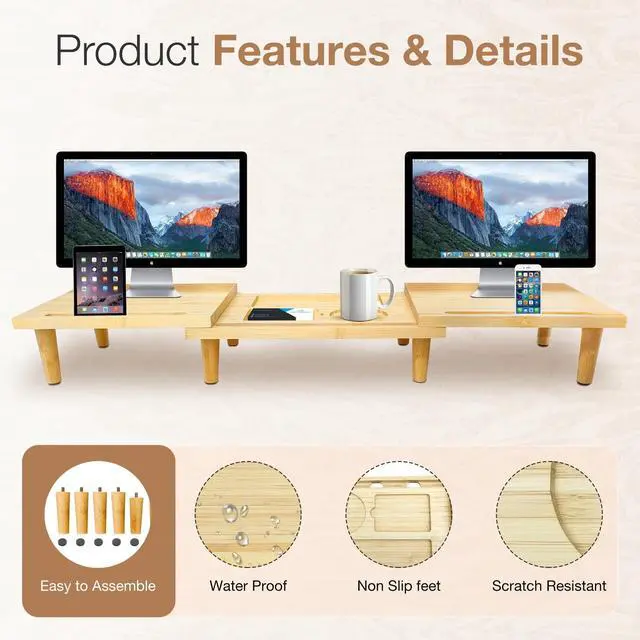 Extend Mode) Height: 8 cm (side panels), 6 cm (middle panel) EFFORTLESS ASSEMBLYAssembling your new desk organizer is quick and easyno tools required. With a simple manual adjustment of the cylindrical angles, you can lock the sideboards into place in just 2 minutes. COMPLEMENTS YOUR WORKSPACE! Our modern computer stand not only enhances your workspace but also complements your office with its elegant solid wood design. Our dual monitor stand for desk with minimalist style seamlessly blends with any decor, creating a professional atmosphere. HAVE ANY QUESTIONS? Feel free to reach out to usour team is ready to support you!