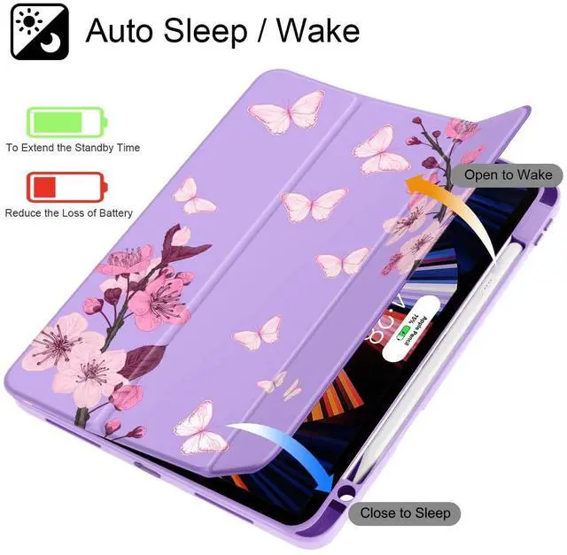 May Chen for iPad Pro 11 inch M2 4th Generation 2022, iPad Pro 11 3rd/2nd/1st Gen, Case with Transparent Shockproof Back Cover [Built-in Pencil Holder, Auto Sleep/Wake, Pink Cherry Blossom