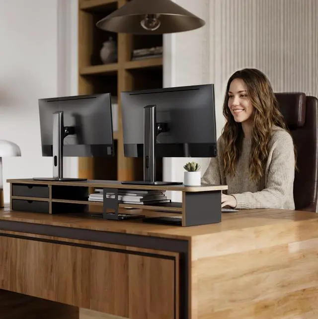 Space-Saving Design: Dual monitor riser is 42.5"L x 9.3"W x 5.5"H, this laptop riser is big enough to support two monitors. 2-tier desktop organizer and two semi-transparent frosted acrylic drawers to keep your workspace organized ^^