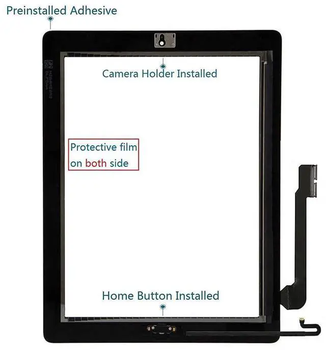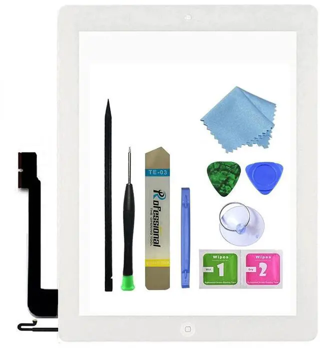 Packaging Includes: For iPad 4 Glass Screen Digitizer Complete Full Assembly with Home Button, Camera BracketFrame Bezel and Adhesive PreInstalledTool kit incl1x 1.5 mm phillips screwdriver 1xBattery Isolation Tool 1xMetal Knife Opener 1xPlastics pry bar 2xOpen shell fragments 1xSuction cup 1xCleaning clothNOTE: DO NOT glue touch screen with your ipad until you TEST and make sure it works with your ipad. If you don't know how to install it, we suggest you to find a professional technician to do for you-parts damaged during installation are not accepted for return. Installation guide is not included. We recommend that you watch online video installation on youtube or consult professionals for help to ensure a successful installation.