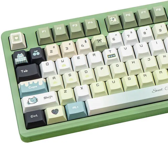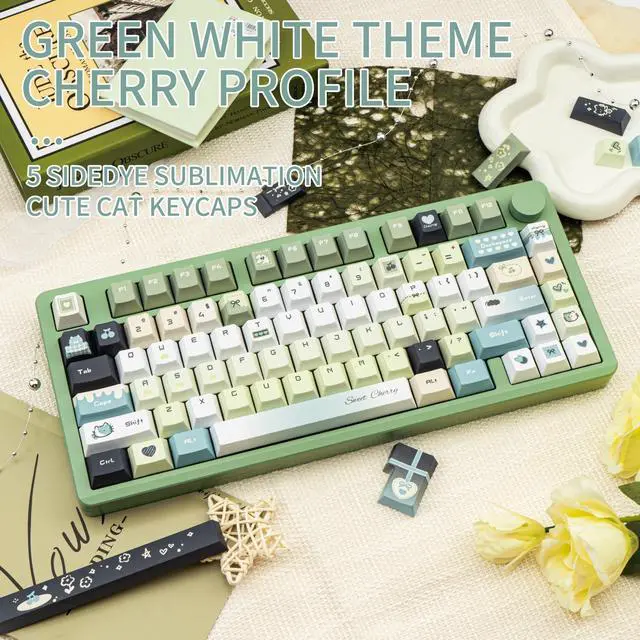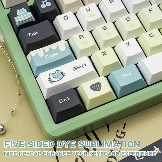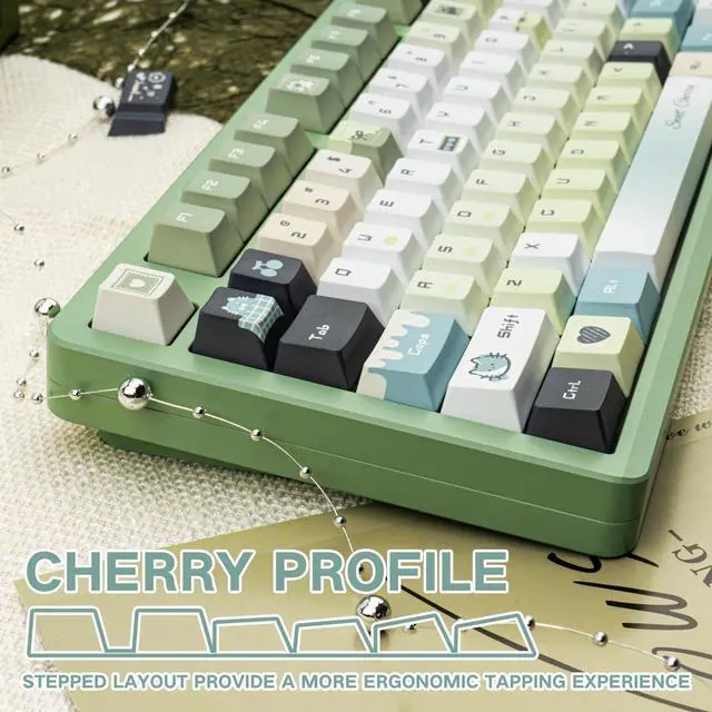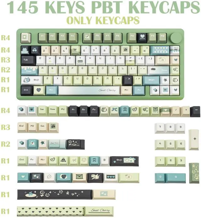 Gradient Green Design: COOMICKEY's Gradient Green keycaps feature charming kawaii motifs, immersing you in childlike wonder. More than an accessory, they blend practicality with aesthetics, enhancing your desk and typing experience. Ideal for those seeking uniqueness and comfort, making typing more enjoyable and personalized ^^ PBT MaterialCrafted from ultra-durable PBT plastic, these green keycaps resist shine, oil buildup, and scratches even under intense daily use. The 1.7 mm reinforced wall thickness ensures a solid, premium feel while typing, perfect for mechanical keyboard enthusiasts who demand longevity ^^ 5-Side Dye-SublimationUnlike basic prints, our full 5-side dye-sublimation process locks vibrant hues and intricate patterns onto every surface of the keycap. No fading, no chipping ^^ Cherry Profile KeycapsThe cuet keycaps use cherry profile to provide a familiar, ergonomic keying angle that reduces finger fatigue and makes it easy to enjoy a natural feel that combines speed and comfort ^^ 145 Keys for Total CustomizationThis mechanical keyboard Keycaps 60 75 100 percent can work with full-size ANSI/ISO Layouts keyboards, 61/64/68/84/87/100/104/108 keys are suitable. Mix and match keys to create your dream setupplus, the included metal keycap puller makes swapping a breeze.