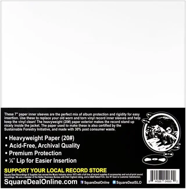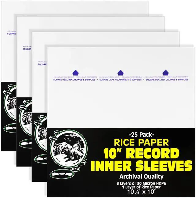 These archival quality, static-free rice paper sleeves are a great choice for protecting your precious record collection. The rice paper adds a nice rigidity to the inner sleeves, and is sandwiched between two layers of 30 micron (appx 1.2 mil) High Density Polyethylene (HDPE), with another layer of 30 micron protecting the other side of your 10" Record. This is a total of over 3mil plastic protection! These sleeves provide the best qualities of inner sleeves made out of paper or plastic.