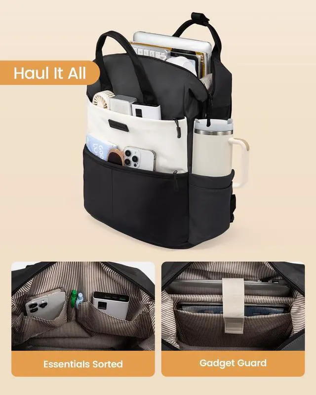 Wide Opening & Organized StorageWide opening for easy access. 12 pocketsincluding sleeves for a 15.6 -inch laptop, iPad, and 40oz bottlekeep items organized and within reach ^^ Large CapacitySpacious 11.8" x 18" x 5.4" design fits a 15.6" laptop, iPad, books, phone, umbrella, water bottle, clothes, and moreperfect for daily use or travel ^^ Weather-Resistant DurabilityMade of high-density polyester with reinforced stitching on straps and handles, plus sturdy, smooth zippers. The water-resistant fabric keeps your belongings protected ^^ Ergonomic ComfortWide, ergonomic shoulder straps with breathable padding help distribute weight evenly and improve comfort ^^ Travel-Friendly DesignIncludes a luggage strap for attaching to suitcases and an anti-theft back pocket for valuables.