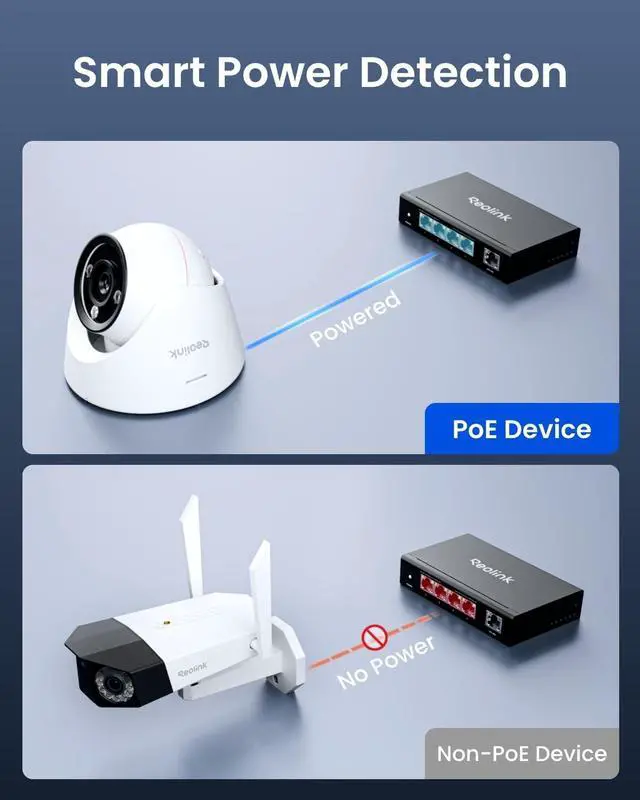 PoE PerformanceFeatures 4 downlink ports and 1 uplink port, all supporting 10/100/1000Mbps transmission speeds and compliant with IEEE 802.3 af/at (PoE+). Provides stable power and fast data transfer for multiple PoE cameras, wireless access points, and other devices. ^^ Smart Power ManagementAutomatically detects whether connected devices require power and how much they consume. When total power usage exceeds 65W, the switch intelligently powers down ports in reverse order to maintain stability on priority devices. ^^ Advanced ModesActivate Extend Mode to set ports 12 to 10Mbps and extend PoE transmission distance up to 820 ft (250 meters) * ideal for long cable runs.
