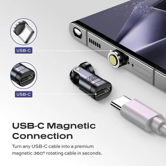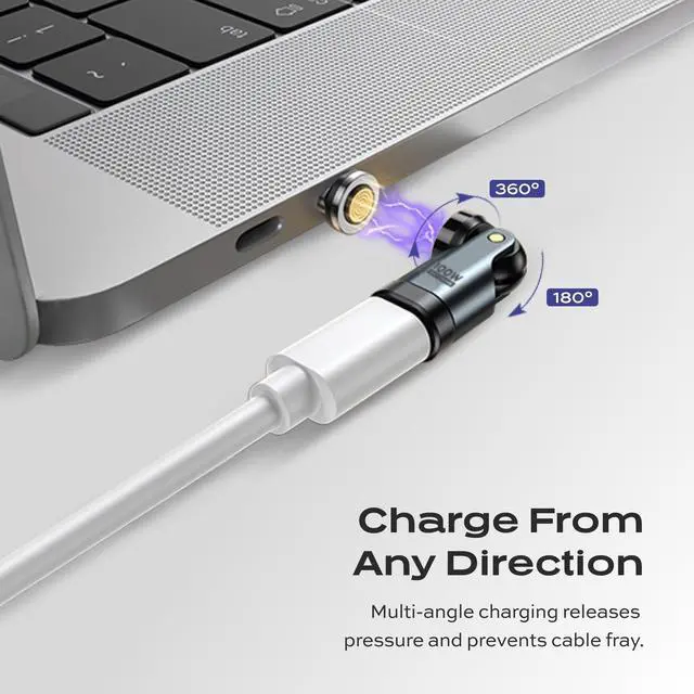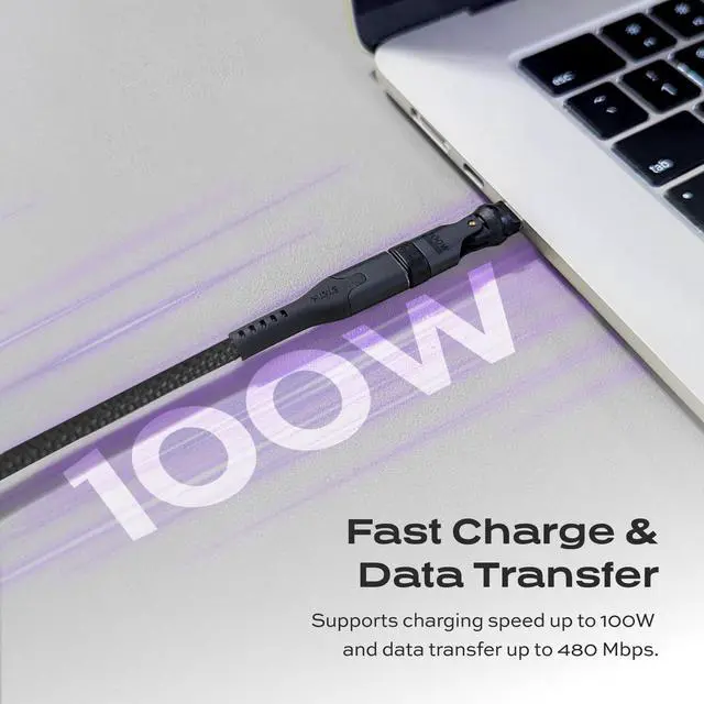 Flexible 360 + 180 Rotation Say goodbye to cable stress and port damage. The dual rotation design gives you unlimited flexibility, letting you charge comfortably from any angle. ^^ Effortless Magnetic Charging Snap your cable in place with one hand. The magnetic connection ensures a secure fit every time, making charging fast and frustration-free. ^^ Lightning-Fast 100W Power Delivery Power up any device at maximum speed. From smartphones to laptops, enjoy ultra-fast charging with up to 100W output. ^^ Seamless Data & CarPlay Ready Transfer files at 480Mbps while staying connected.