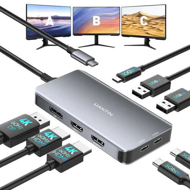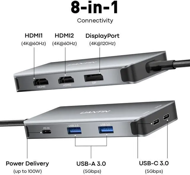 Its 100W high-power PD charging port enables fast laptop charging while connecting all your devices, keeping your desk clutter-free. ^^ Compatibility and Durable DesignFully compatible with Windows and macOS systems (mirror mode only). Featuring a premium aluminum alloy casing for enhanced heat dissipation and durable nylon braided cables, it combines aesthetic appeal with reliable everyday performance. ^^ Plug-and-Play for Any ScenarioThe UANTIN USB-C Docking Station features a sleek design that requires no drivers for instant plug-and-play functionality, effortlessly boosting productivity. It serves as the ideal solution for connecting displays, high-speed storage devices, USB peripherals, and charging laptops.