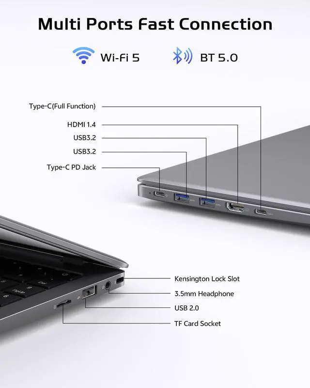 ^^ Vibrant 14 inch FHD IPS Display Enjoy crystal-clear visuals on this 14 inch laptop whether you're working on spreadsheets or watching movies. The anti-glare screen ensures comfortable viewing for students during online classes and professionals during long work hours, making the entire experience highly effective. ^^ Complete Connectivity Enjoy ultimate flexibility with not one, but two Type-C ports, one all-purpose for data, video, and charging, plus a dedicated charging port. With added USB 3.2 / 2.0, HDMI, TF card support, and a security lock slot, this business laptop connects you to everything you need.