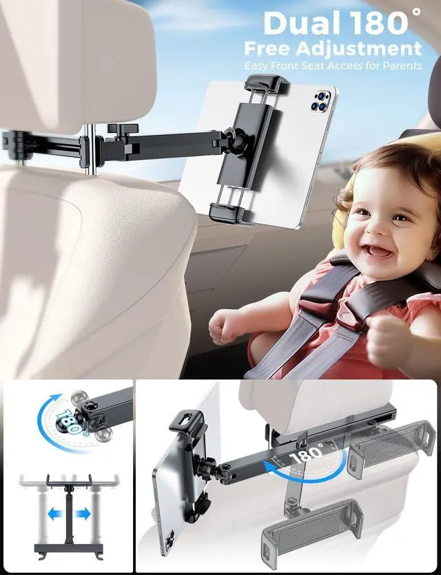 Extension Arm: This iPad holder for car backseat features a unique biaxial extension arm that allows you to adjust the viewing distance and angle with ease. This design ensures you can position your tablet in the middle of two seats, making it perfect for sharing the iPad screen with other passengers. The arm is simple to extend and retract, making it easy for kids to operate as well. This is ideal car travel essentials for long trips, providing entertainment for everyone. ^^ Easy Installation with 360