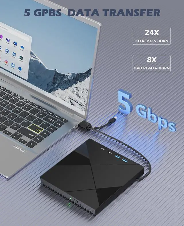 Boasting up to 8x DVD-R Write Speed and 24x CD Write Speed for outstanding performance and quick data accessibility. ^^ Plug & PlayNo additional drivers are required for this external cd drive. Simply plug it into your laptop or desktop pc, insert your cds or dvds, and let our drive do the rest. Enjoy using media player, burning, or ripping software to read, write, and rip your discs! ^^ Broad CompatibilityThis external cd/dvd drive for laptop is designed to work seamlessly with Windows (98/ SE/ ME/ 2000/ XP/ Vista/ Windows 11/10/8/7), Mac OS, making it suitable for a wide range of PCs, Laptops and Comprehensive Computers.