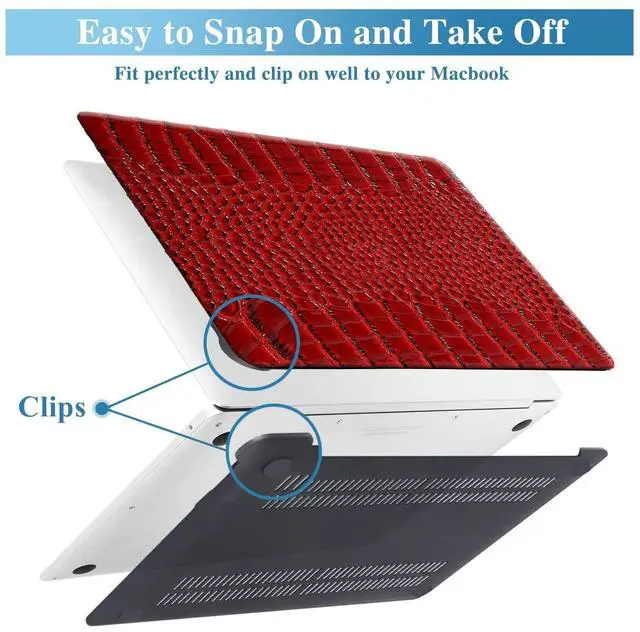 Features: Made of PU leather and PC materials, protecting your laptop from scratches and and everyday damage. This gorgeous crocodile-embossed macbook case has a vibrant and shiny finish that creates a striking visual effect. The rich, textured look of crocodile/alligator skin adds a tactile dimension to your device. Thoughtfully designed with a perfectly positioned cut-out for the logo. Snap-on design, easy to put on and remove. Fully access to all ports and buttons. The additional silicone keyboard skin protecting your keys from dust, spills and crumbs. Bottom vents help keep your laptop cool and four non-slip rubber pads keep your laptop in place. Snug fit, ultra-thin and lightweight, it won't add any noticeable weight or bulk to your laptop. Each piece of faux crocodile leather is crafted with its own unique natural grain. True luxury should be as unique as you are!