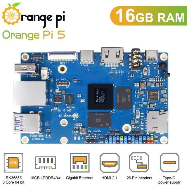 Performance]: Orange Pi 5 single board computer uses Rockchip RK3588S new generation 8-core (4-core A76 and 4-core A55) 64-bit processor with 8nm process design. Main frequency up to 2.4GH z, integrated ARM Mali-G610 GPU, embedded high-performance 3D/2D image acceleration module, built-in AI accelerator NPU with up to 6 TOPS, supports INT4/INT8/INT16 mixed operation, with 4GB/8GB/16GB/32GB (LPDDR4/4x), and up to 8K display processing capability. ^^ [8k