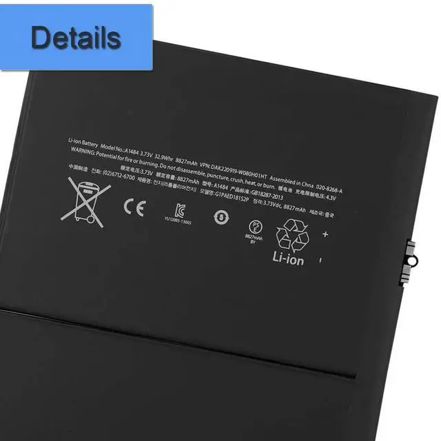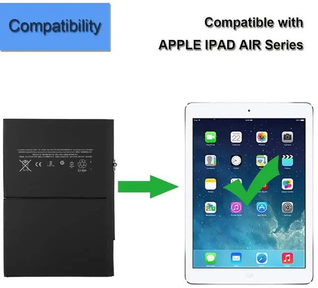 PolymerPackaging: 1 x battery, 1 x ToolsCompatible withApple iPad Air A1475 iPad 5, iPad Air A1474, iPad Mini AirNotice before purchase1. Be carefully check the model number of your device to see if this battery is compatible with your device. 2. A new Li-ion battery will achieve its best performance after 2 or 3 complete cycles of charge & discharge. 3. When you install it, be sure the connector has been properly connected to your device. 4. Do not use low quality third-party adapter charger to charge your device, that will shorten the battery's life. Contact usIf you have any questions or any issues when using our product, please send us a message, we will answer you within 24 hrs. Thank you for your time.