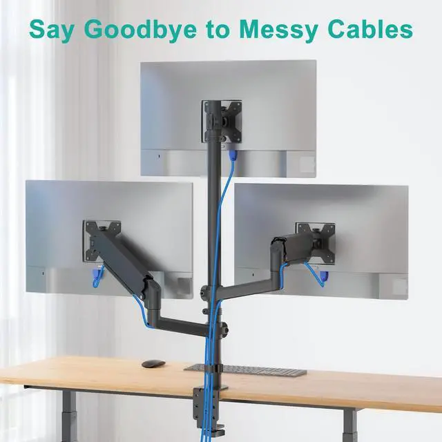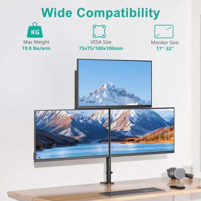 Monitors: WALI triple monitor mount is expertly engineered to support most flat and curved LCD/LED screens ranging from 17" to 32". With a robust weight capacity of up to 19.8 lbs and for 75x75mm and 100x100mm mounting holes. Please verify your monitors specifications before purchasing ^^ Flexible Adjustment & Ergonomic DesignTop bracket features +15to -15tilt and 180swivel, while the side brackets feature +75 to -45 tilt and 180 swivel for optimal viewing angles and glare reduction. All brackets boast full 360 rotation. Both the top bracket and arm are height adjustable along the tall center pole for optimal placement ^^ Durability & StabilityClamp base and arms are made of steel for maximum strength, scratch resistance, and durability. The triple monitor mount survives 20, 000+ fatigue tests (equivalent to 10 years of daily adjustments) ensuring long-lasting support and enhanced screen stability for various setups ^^ Easy InstallationC-clamp for desks thickness 0.39 to 4.33". grommet mount for desks thickness 0.39 to 2.17". All tools included, with straightforward instructionssetup even for beginners. Built-in cable management keeps wires organized, keep your workspace clutter-free ^^