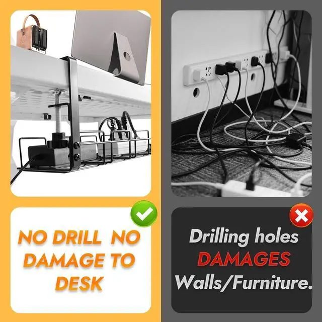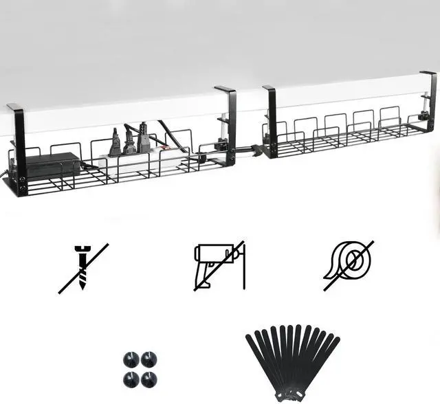 An ideal solution for organizing power strips, adapters, routers, and various charging devices! This product helps keep your desktop and under-desk area neater and safer than ever before. The set includes cable ties and fixing clips for easy and proper management of your power setup. ^^ No Drill MountedA cable management tray can be assembled in under three minutesits that simple. Just clamp the side clips securely to the edge of your desk, thread cables through the side holes, and tidy excess cords neatly in the baskets. Designed for flexible inward or outward installation, this tray adapts to various scenarios, offering effortless wire organization and a cleaner, more efficient workspace.
