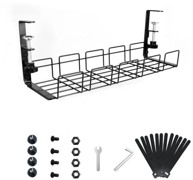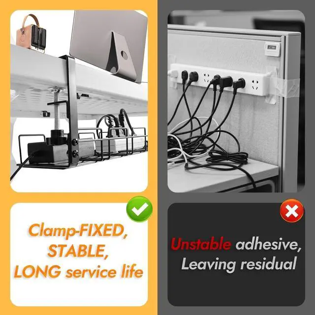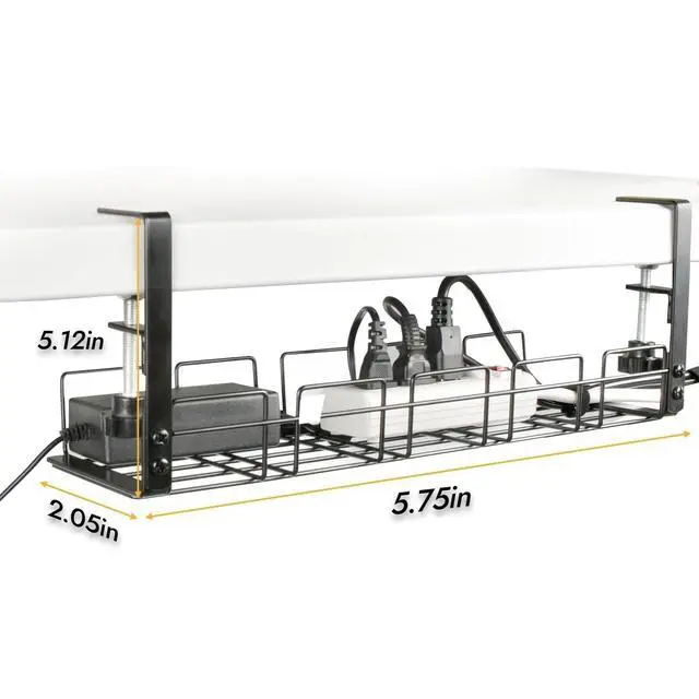 ^^ Sturdy and BeautifulCord management under desk is made of high-quality carbon steel and holds about 15 lbs. The wire basket has 2 holes on each side of the tray to enable your cables to pass freely. Cable baskets are suitable for desk thickness use from 0.4" to 1.85". ^^ Space Saving & Keep OrganizedKeep your workspace neat and hassle-free with this desk cable management tray. It neatly holds power strips, USB hubs, adapters, and data cables out of sightand out from under your feet. No more tangled wires or vacuum mishaps! Ideal not only for desks but also for kitchen counters and outdoor setups, this organizer helps you maintain a clean and clutter-free environment wherever you need it.