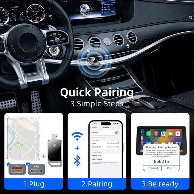 Upgrade Chip Fast TransmissionOur Carplay Adapter is equipped with 5.8GH z Bluetooth, 2025 latest edition chip, transmission speed is as fast as lightning, only 3 steps 10 seconds to immediately connect to the iPhone, so that the wireless car adapter to free your hands, enjoy a super smooth driving experience, while worry-free navigation, while you can listen to music, answer the phone ^^ Plug and PlayAre you still using wired carplay? Does the messy cable and having to unplug and plug in your phone every time bother you? With our upgraded adapter, effortlessly add wireless functionality to your car's original Apple CarPlay and enjoy wireless access to CarPlay features like music, maps, calls, and more ^^ Stable Connection No DelayBEVIU CarPlay Wireless Adapter Proven by 500-hour vibration tests, it stays stable even on rough roads.