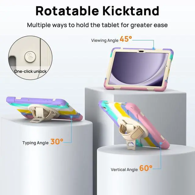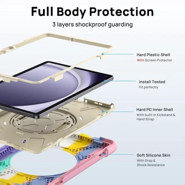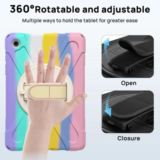 ^^ Superior Protection: This tablet case is designed with a triple-layer reinforced structure, the soft silicone outer layer combined with sturdy PC material and built-in screen protector protects your tablet. Whether you are traveling outdoors, working in business, or playing with your kids, all can be handled with ease. ^^ Newly Upgraded 360 Rotatable