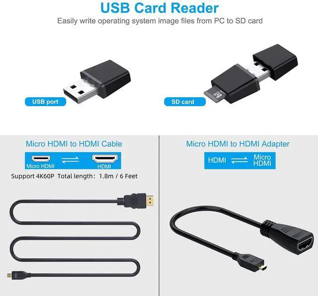 ^^ Micro HDMI Cable - provides up to 4K resolution and up to 60P to support 4k60P. It provides CEC support to allow a CEC compatible TV remote to control the Raspberry Pi in popular media center operating systems. ^^ Packaging Content - you will receive pi case, raspberry pi case heatsink, 30mm raspberry pi 4 fan, 5v 3a usb-c power supply, hdmi -micro hdmi adapter, 6 feet micro hdmi cable, usb card reader, 4 rubber feet for pi 4 case.