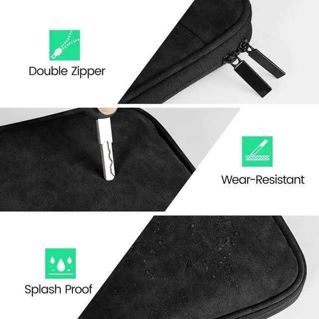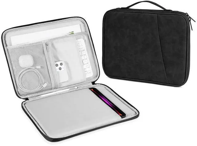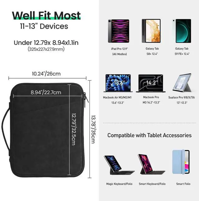Internal size: 12.79" x 8.94" x 1.1" ^^ Premium MaterialThe iPad sleeve is made of waterproof synthetic suede, which would protect your device from fluids, and rain. Durable scratch-resistant, and easy to clean. Smooth polyester lining makes taking the tablet in and out easy and leaves no marks on the screen ^^ Shockproof Protection 1.1 inch padded protective iPad bag with premium sponge layer for cushioning and shock absorption, reinforced all around with a hard frame to protect your device from impact, drop, bump, and squeeze. The 3-layer protection design makes your device safer ^^ Get Organized7 compartments, supports front pocket storage, can hold 1 tablet, Smart Keyboard or Magic Keyboard, stylus, mouse, charger, cables, earphones, notes, cards, and other iPad accessories, efficient iPad carrying case for office, college, business, and daily use ^^ Travel-FriendlyThe iPad travel case has a comfortable handle, a smooth 2-end zipper, and supports a 180 opening for quick access. it's slim and lightweight, you can easily put it into a backpack or trolley case, making it ideal for carrying on business trips or travel