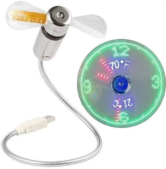 Temperature Clock FanThis usb fan is a fan with the special blade, that creates an LED temperature clock face. Can display time and temperature (Fahrenheit and Celsius) on a single fan surface, automatically senses outside temperature without adjustment. Allowing you to enjoy cooling wind while playing, sensing a new cool display experience. ^^ Free Adjustment Angle & LightweightPVC soft fan blades are safe to use, the gooseneck is flexibly bent, you can easily adjust the fan to any place you need. and the weight is only 2.12 oz, which is very light and easy to carry.