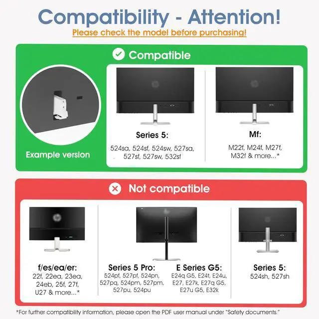 Attention: This VESA Mount HP is NOT compatible with HP Series 5 - 524sh, 527sh and not compatible with any Series 5 Pro model! ^^