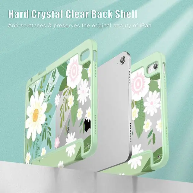 Tuiklol Case for iPad Air 11'' (M3 2025/M2 2024) 6th Gen/iPad Air 10.9'' 2022 2020 5th /4th Gen, Buit in Pencil Holder with Shockproof Cover Clear Back Auto Wake/Sleep, Flowers Green