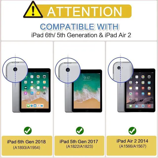 Compatible Models: YIMIKOL cases are exclusively design for iPad 6th Generation (2018 Release), iPad 5th Generation (2017 Release) and iPad Air 2 (2014 Release),
