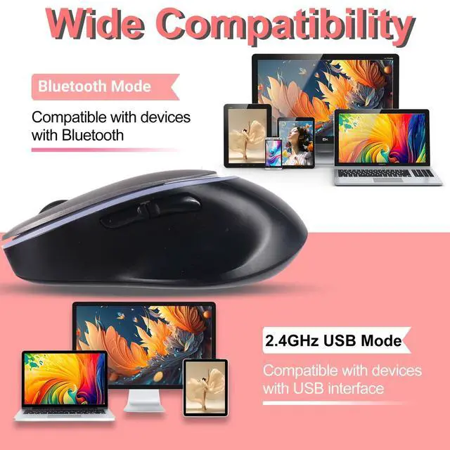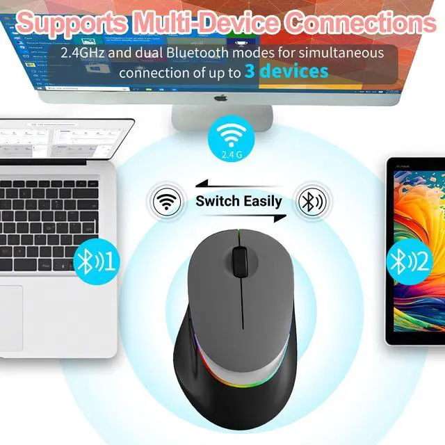Wireless Tri-Mode Ergonomic MouseDesigned for productivity and gaming enthusiasts, this ergonomic, rechargeable wireless mouse blends cutting-edge technology with user-friendly features. The RGB Lighting Wireless Optical Mouse features an optical sensor for smooth tracking on a variety of surfaces. Tri-mode connectivity (BT1/BT2 + 2.4G USB Wireless) allows for seamless switching between devices via Bluetooth wireless or with the included USB-C adapter, ensuring lag-free gaming. The RGB lighting adds a stylish touch for nighttime use or gaming. The Wireless Bluetooth Tri-Mode Computer Mouse features a built-in rechargeable battery, eliminating the need for disposable batteries.