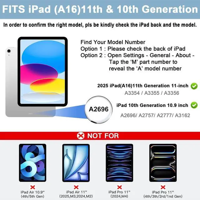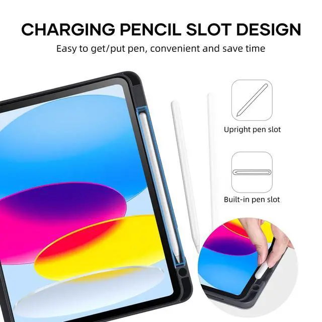 Note: Please be kindly check your iPad back model before purchasing, NOT fit other iPad models. ^^ MAGNETICALLY REMOVABLE KEYBOARD----The magnetic iPad 10th 10.9 inch 2022 keyboard and case are separated, magnetically attached, the keyboard can be removed from the case if not needed. Bluetooth connectivity is easy to operate. A spring mechanism underneath each key ensures a tactile response with every stroke, helping you to type faster and with less error than on a touchscreen. Please charge it when keyboard power indicator flashing red. ^^ HEAT RELEASE & IPAD WHOLE BODY PROTECTION----iPad 10th keyboard case comes with honeycomb grid pattern design is better for heat release and anti-skid, and offers 360 full protection against scratches, bumps or dents, protecting your tablet from all sorts of dropping accidents, also against fingerprints, shocks, scratches and dust. ^^ BUILT-IN PENCIL HOLDER & MULTIPLE VIEWING ANGLES----Our keyboard case comes with a slot for holding your Apple pencil stylus that lets you effortlessly reach for your pen whenever you want to use the touch pen function (not including ipad pencil, pen cap and adapter). Internal non-slip design for propping up the tablet into different viewing angles in landscape mode.