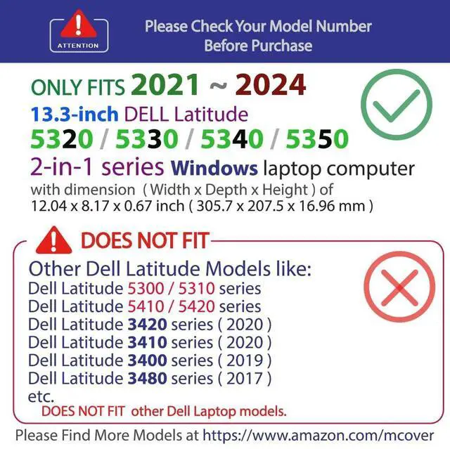 NOTE: Before placing order, PLEASE make sure to verify your laptop model number as this case is MODEL specific and NOT interchangeable. ^^ NOT fitting other Dell Latitude laptops. NOT compatible with ANY other Dell laptops as well. ^^ Made of high-quality translucent polycarbonate material which is shatter-proof and will protect your 2021 ~ 2024 13.3" Dell Latitude 5320 / 5330 / 5340 / 5350 2-in-1 laptop computers all around ^^ Designed to perfectly fit the 20212024 13.3" Dell Latitude 5320 / 5330 / 5340 / 5350 Windows Laptop with dimension of 12.04 x 8.17 x 0.67 inch ( 305.7 x 207.5 x 16.96 mm ) ^^ 2-piece light-weight( 7.6 oz or 215 g) shell easily snaps on and off.