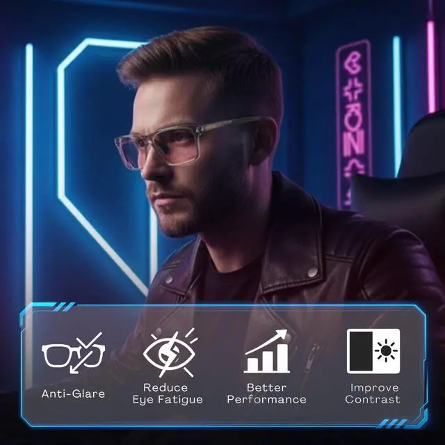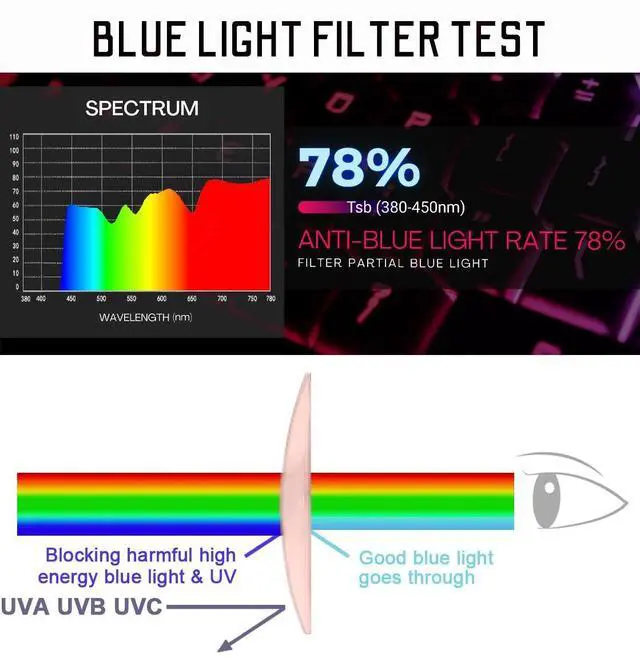 Premium Gaming & Computer EyewearProfessional computer glasses built for extended screen use & reducing eyestrain/digital eye fatigue. Ideal for gamers, programmers, and individuals spending long hours looking at digital screens. Unisex, size M for average adult face sizes. ^^ Rose Edition. Blue Light & UV Blocking. Improved Visual Clarity Advanced 78% harmful blue light reduction (Tsb: 380-450nm). 100% UV blocking. Anti-glare for eyestrain reduction. Color-optimized low-tint lenses deliver sharper screen clarity and enhanced contrast. Rose color fashion lenses present a modern, contemporary look. ^^ Lightweight, Durable, Secure, AdjustableConstructed with quality TR90 material, the frames are lightweight, flexible, and built to last. Adjustable nose pads allow for customizable fit. Rubberized non-slip temple tips ensure secure lockdown feel. ^^ Designer Style for Any OccasionCrafted in a sleek, designer-inspired classic aesthetic. The RT100 tinted computer glasses blends timeless fashion with modern practicality into a professional, tasteful visage. Perfect for casual, business, gaming scenarios and more a statement piece you can wear confidently on and off the screen. ^^ Easy Maintenance & Complete SetFor best maintenance results, wash dust & grime off glasses with clean water, tap lenses to soak up moisture with included microfiber pouch, then gently blow dry lenses with warm air or shade dry away from sunlight under room temperature before use. Do NOT use any chemical solutions. This set includes 1 pair of RT100 computer glasses, 1 microfiber cloth, and 1 protective hardcase.