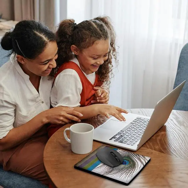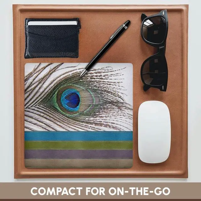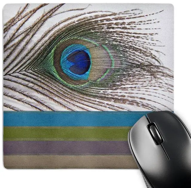 Peacock Feather with Ribbon Look Mouse Pad is 8" x 8" x. 25" and is made of heavy-duty recycled rubber. Matte finish image will not fade or peel. Machine washable using a mild detergent and air dry.