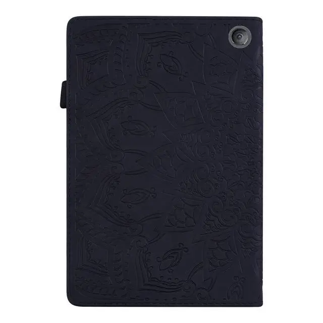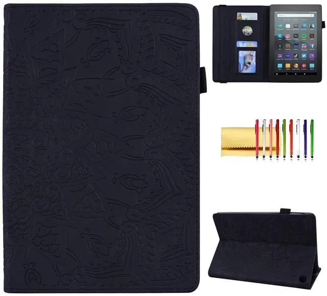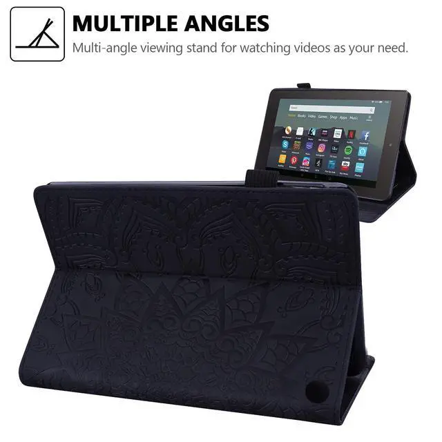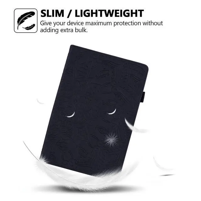 Features: * Pretty mandala flower embossed surface, offers exquisite and attractive look for your tablet. * Easy access to all features and controls (camera, charging port, volume button, etc) without removing the case. * Elastic strap closure ensures cover securely closed, double fixing your device when fold the front cover backward for reading. * Front-to-back protective cover case give a full protection for your tablet against dust, water, fingerprints, scratches, shocks and bumps. * It can be used as a stand with adjustable horizontal position that allows you to view it easily when it is placed on a desk. * Interior with 2 card holders for carrying your ID/ credit cards/ business cards/ photos. * Side with an elastic loop holder for stylus.
