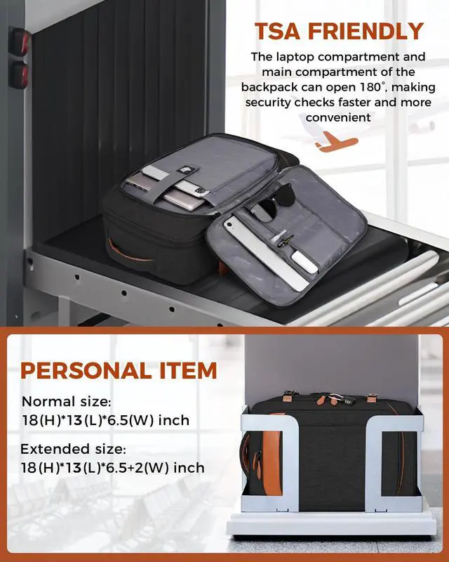 Expandable: This travel backpack for women carry on measures 18 x 13 x 6.5 inches and can expand by 2 inches, weighing just 2.59 pounds. With a 40L capacity, it's great for 3-5 day trips, and the padded shoulder straps ease shoulder pressure during long travels. It also features a zippered pocket on the left strap for coins or cards. The TSA-friendly design opens 90-180 degrees for easy airport security and fits in overhead bins ^^